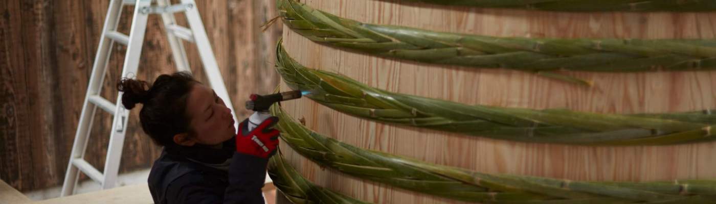 Despite the deeply hierarchical nature of Japanese culture, the dire reality allows for free-flowing information and lax social exchange. The word for this hierarchy is tate-shakai (lit. trans. vertical society) and it has been historically ingrained in ageist, sexist politics. But the Summit is characterized by lateral conversations, going so far as to proactively teach (e.g., how to braid the bamboo hoop) as opposed to safeguarding trade secrets or following the craftsman expectation that apprentices learn by only watching from afar. This bamboo braid would otherwise unravel if not for the intricate weavings in and out of certain crossings. It is braided first by two strands of bamboo at 13 to 15 meters each, then two more strands follow to form a chevron like pattern. This is embodied knowledge; it is practiced by and stored in the bodies that learn it. Part lariat and part puzzle, the bamboo only bends in one direction which cannot be mimicked with string replicas. This knowledge would disappear if not for the know-how that gets passed down from one generation of crafts-folk to the next, if not for the first-timers who learn the braid, and if not for the repeaters who teach it.